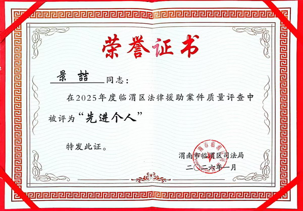 2026年1月21日下午,渭南市临渭区司法局召开《2025年度法律援助案件质量评查工作总结会议》,会议通报2025年度全区法律援助案件质量评查结果,我所景喆律师被评为“2025年度区级法律援助案件质量先进个人”。这份荣誉既是对景喆律师个人工作的高度肯定,也是我所法律援助工作整体成效的有力彰显。