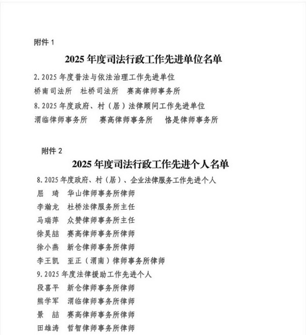 2025年,在渭南市临渭区司法局的统一安排下,赛高律所全面深入学习文件精神,扎实做好司法行政法律服务工作,在全区司法行政工作中成绩突出,被渭南市临渭区司法局授予“2025年度普法与依法治理工作先进单位”、“2025年度政府、村(居)法律顾问工作先进单位”称号,我所景喆律师、徐昊喆律师分获“2025年度法律援助工作先进个人”、“2025年度政府、村(居)、企业法律服务工作先进个人”称号,荣誉既是肯定,更是鞭策。
