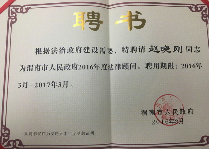 赵晓刚律师政府法律顾问聘书