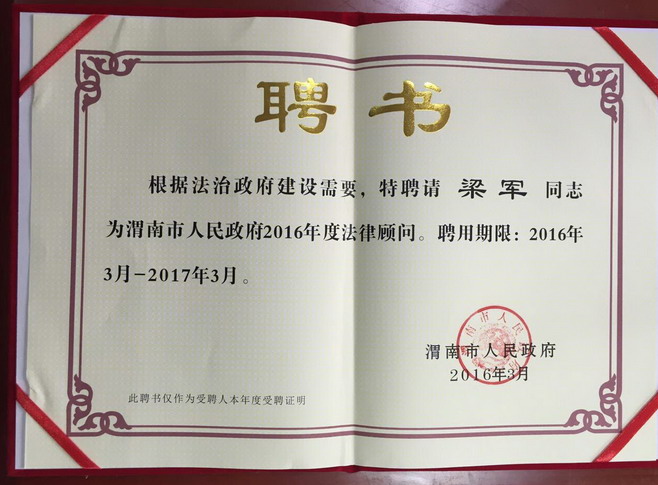 梁军律师政府法律顾问聘书