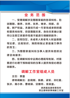 赛高律师事务所选派经验丰富、口碑良好的景喆,赵晓刚,陈鹏,梁军,孙红星,南小林,曹晓瑛,安雅玲,张冰,徐昊喆等十名优秀律师做为调解员,本着依法调解、平等自愿、中立公正和便捷高效的原则,对涉及婚姻家庭的各项纠纷进行调解,宣传妇女、未成年人和老年人权益保障,预防和制止家庭暴力,为婚姻家庭纠纷当事人提供法律咨询服务;对于需要进行心理干预、心理疏导的当事人提供心理咨询服务,既节约司法资源和诉讼成本,又促进纠纷和谐解决。